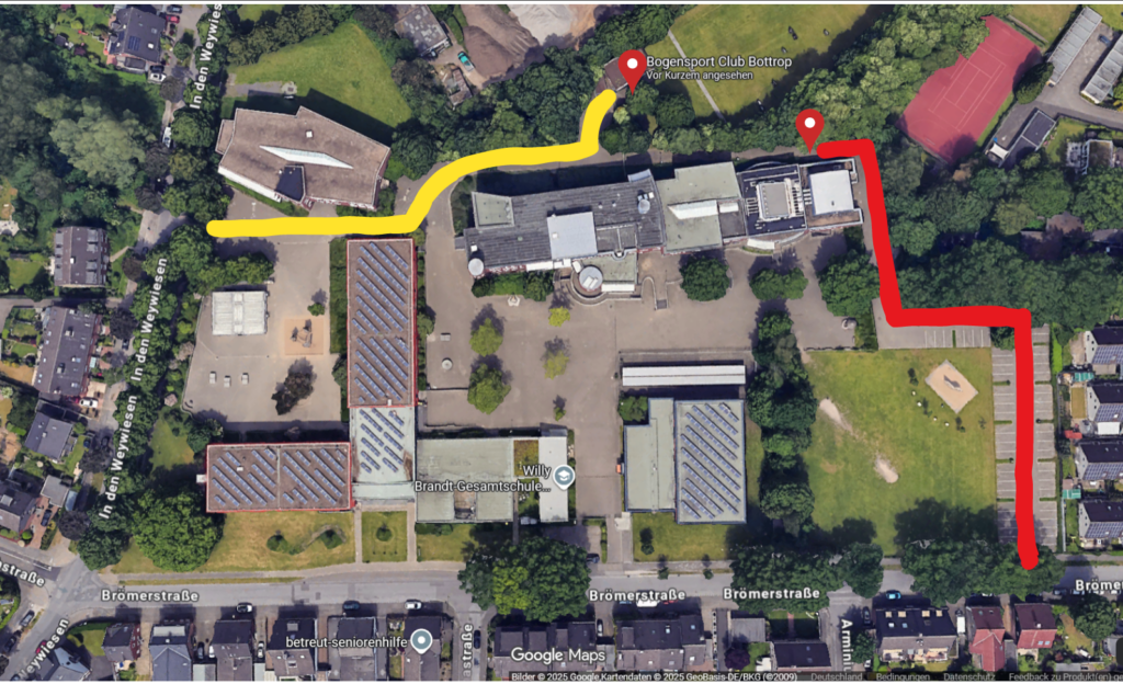 Für die laufende Wintersaison erfolgt die Anfahrt daher über die Schulhofzufahrt an der Straße „In den Weywiesen“. Bitte folgt dem gelben Weg auf unserer Anfahrtsskizze und geht über unseren Platz zur Halle (siehe auch Anfahrt unter Training).